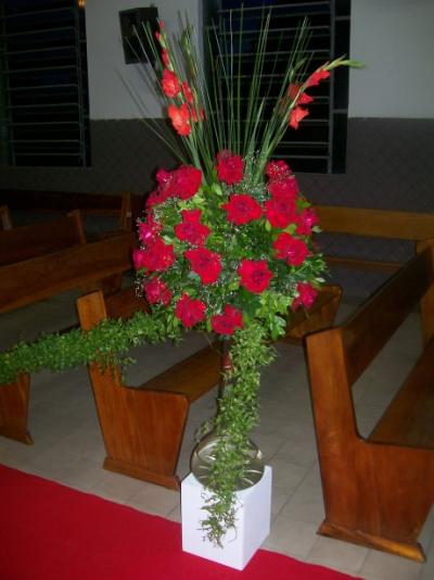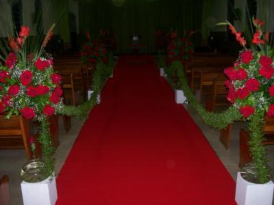 Arranjo em rosas vermelhas e palmas, em colunas de vidro e heras nos corredores