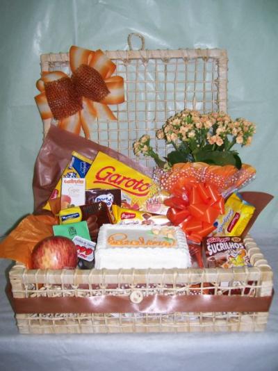 Cesta de aniversário em baú de palha quadrado, com 14 itens