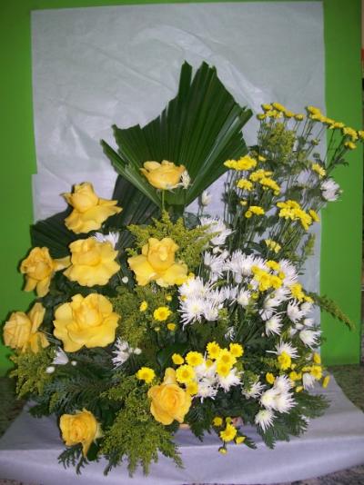 Arranjo Floral feito com rosas amarelas e crisântemos nos tons amarelo e branco