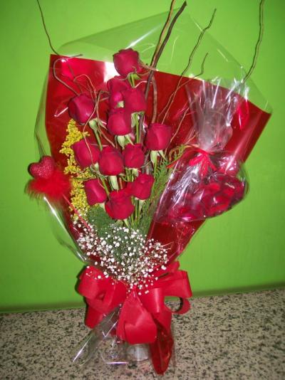 Elegante Buquet de rosas vermelhas, simbolizando a paixão, com gipsofila branca, representando a paz que deseja para o casal, acompanhada de um pick de coração, para deixar o buquet ainda mais romântico.