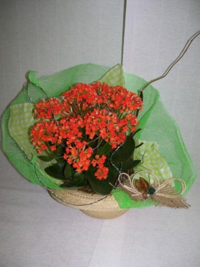 Kalanchoe laranja no chapéu de palha, com tela, papel de seda e laço de juta