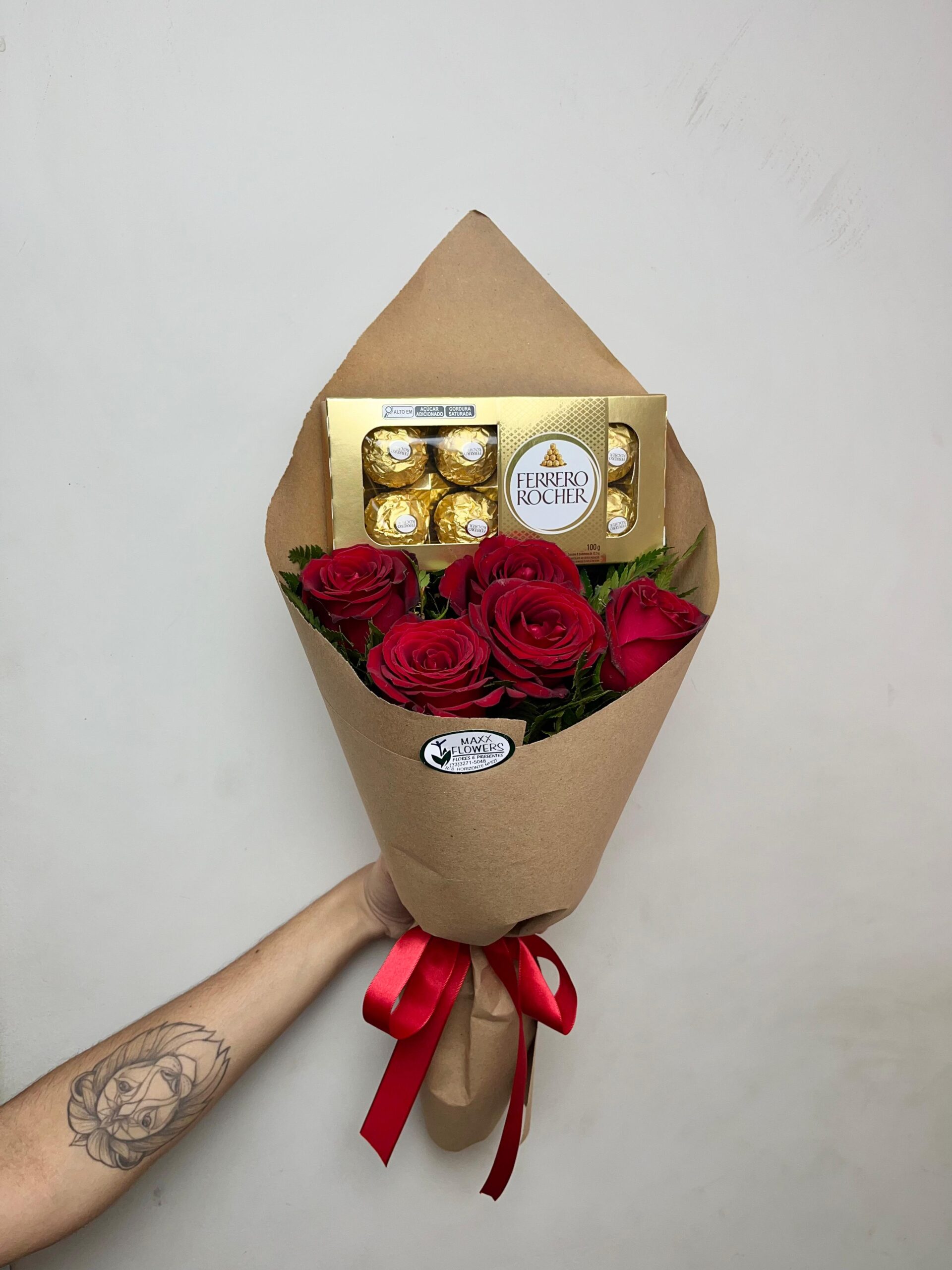 Um delicado buquê com 5 rosas e chocolate ferrero, para ocasiões esporádicas. Aquele EU TE AMO de surpresa, ou me ME DESCULPE, um PARABÉNS, seja qual for a ocasião um mini buque, vai te ajudar a levar seu recado.