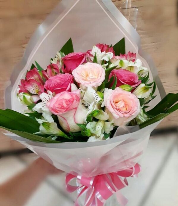 Delicado Buquê tradicional com 6 rosas coloridas e astromélias, envolto em papel celofane.